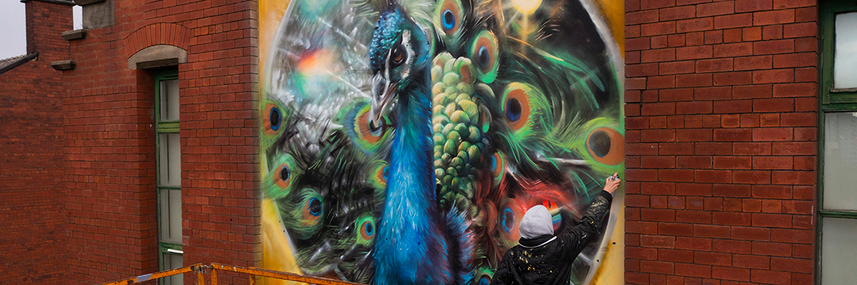 These stormy spring days are full of dark clouds, so it’s time to brighten things up with ‘The Peacock’ mural in Leeds city center celebrating Marching Out Together. Even in these photos furnished by the artist Cbloxx aka Jay Gilleard, you can see how much the new piece can perk up a passerby.