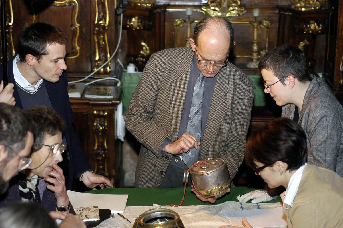 Ernő Marosi examining the inner reliquary of St. Ladislas, 2004 |